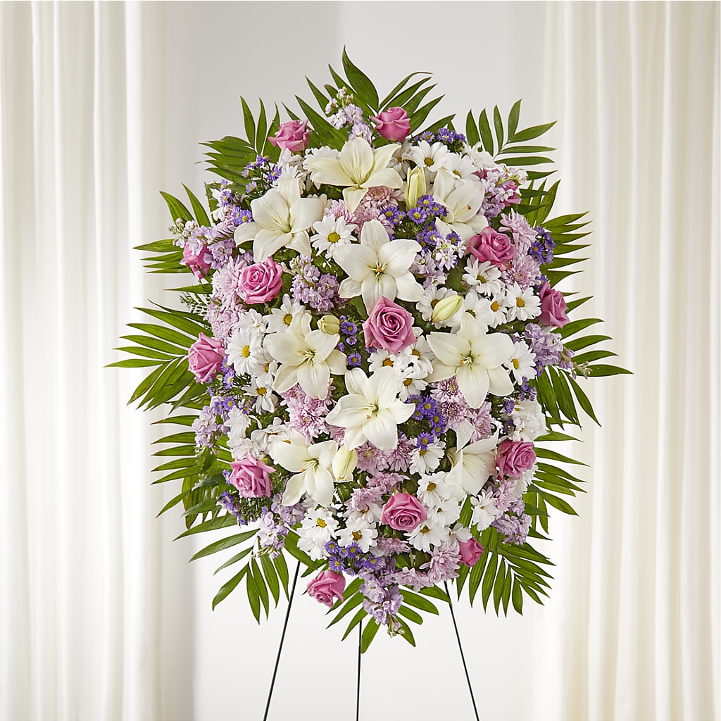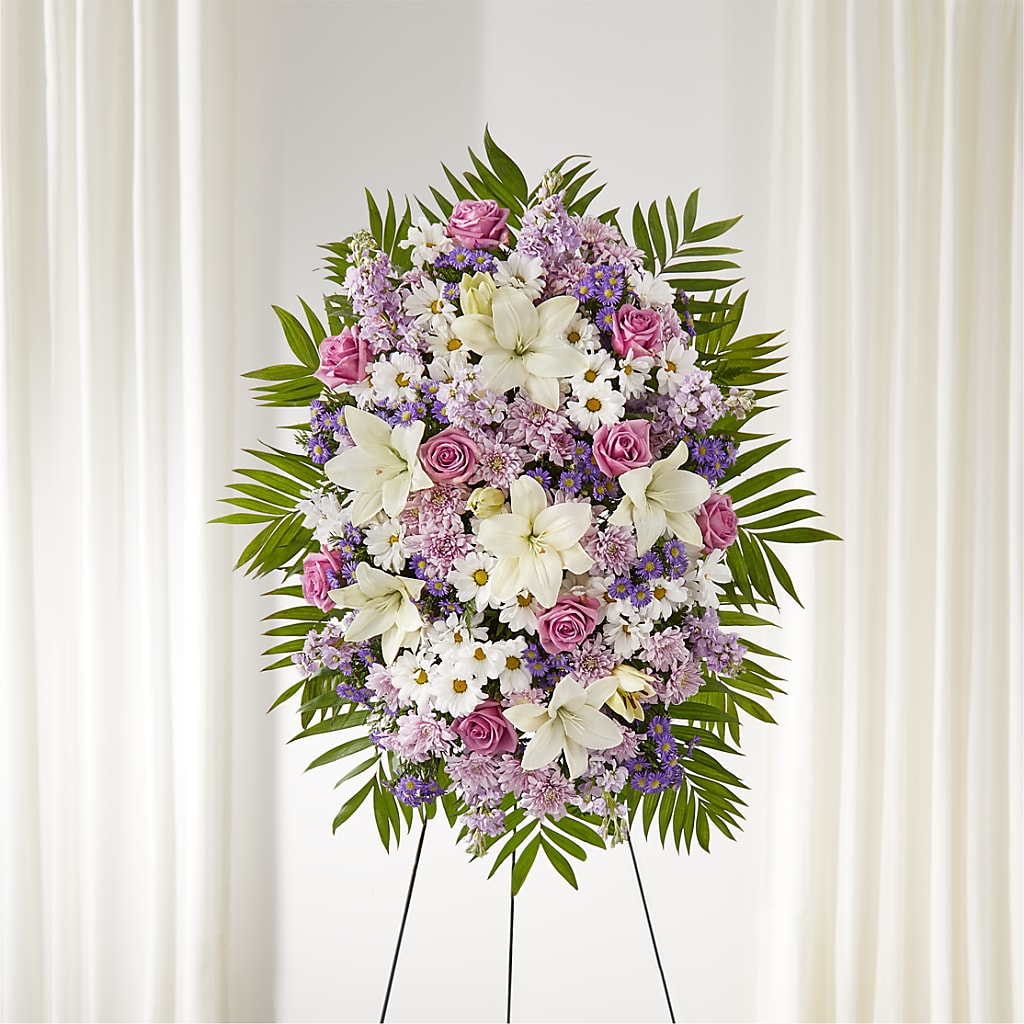 Envuélvalos en un hermoso abrazo en un momento de necesidad con un cálido y acogedor arreglo floral. Este arreglo floral, ingeniosamente diseñado con flores blancas y lavanda, le da un toque especial al servicio de un ser querido.